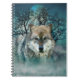Beau loup sur une nuit Foggy avec une photo de Pleine lune Art. Avec des ombres bleues et des arbres à l'arrière. L'art du loup avec une photo couleur bleu vif.