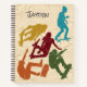 Ajoutez un nom ou un autre texte pour créer votre propre carnet thématique de skateboard personnalisé. La couverture frontale présente cinq illustrations silhouettes de skateboarders en jaune moutarde, bleu turquoise, rouge foncé, orange rouille et vert ensemble contre un arrière - plan à faux grain de bois. Votre texte personnalisé est en gris écrit à la main. La couverture arrière a un motif de coordination du grain de bois.