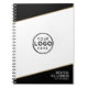 This sleek notebook features bold black angled accents at the top and bottom, separated from the white background by a clean gold line for a sharp, modern touch. Your company logo sits prominently in the center of the front cover, while customizable lines of text along the bottom can include your name and title, business name and tagline, or any details you choose. Perfect for meetings, note-taking, or corporate use, this notebook keeps things polished and professional with fully editable text and layout.