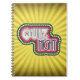 Quiz soirée fêtes carnet en spirale. Avec une grosse typographie audacieuse entourée de lumières de dressing. L'arrière - plan est un motif de sunburst jaune.