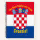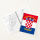 Design présente l'image du drapeau croate en tant qu'arrière - plan à votre texte personnalisable affiché en jaune. L'exemple de texte dit, "Les meilleurs cuisiniers sont de" comme une arche en haut. Ci-dessous, en gros caractères : "Croatie !" La couverture arrière comporte un arrière - plan bleu à votre texte affiché en blanc. Exemple de texte : "Une collection de recettes de la cuisine de Baba." Tout le texte est personnalisable.