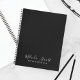 Carnet moderne professionnel avec nom en blanc style de police script moderne avec texte personnalisé en blanc style de police sans serif moderne sur arrière - plan noir.