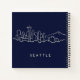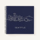 Ce dessin présente une esquisse dessinée à la main de l'horizon de Seattle sur un arrière - plan bleu foncé.