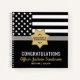 Cette conception comprend un drapeau d'agent correctionnel avec des rayures noires et blanches, ainsi qu'une mince bande argentée. Cette conception est excellente pour remercier un officier qui célèbre un anniversaire ou remercier un officier, des lieutenants, des gardes, des conseillers, des administrateurs et plus pour leurs années de service.
