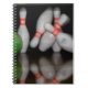 Un carnet en spirale avec une photo d'épingles de bowling et d'une boule de bowling.