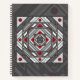 Un mandala carré concentrique prend l'apparence d'un tunnel qui attire le spectateur avec une combinaison de lignes angulaires, de triangles et de cercles dans les tons gris, rouge et blanc pour presque créer une illusion d'optique.