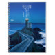 Phare au crépuscule qui clignote son phare dans la mer. Les mots "Suivez la Lumière" sont écrits en blanc.