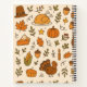 Festive Fall Doodles: A vibrant, repeating pattern illustration featuring all the essentials of an Autumn harvest and Thanksgiving dinner, including cartoon turkeys, pies, pumpkins, and foliage, all rendered in a cheerful, hand-sketched style with a cozy color scheme.
