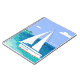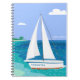 Carnet tropical côtier de Monogram Sailboat. Un voilier avec votre nom sur elle s'approche d'une plage. Vue sur la mer tropicale. Bleu, turquoise, mousse de mer, turquoise, vert, blanc.