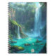Multiple waterfalls cascade into a glowing turquoise pool, surrounded by lush jungle and radiant crystals.