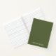 Ce carnet personnalisé présente un design typographique blanc classique sur un arrière - plan vert olive solide. Le nom est placé élégamment dans les tiers inférieurs de la couverture du carnet. Le carnet est parfait pour lire des notes, tenir un journal, ou comme un cadeau réfléchi pour un ami ou un proche.
