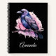 Carnet spiral avec l'image d'un corbeau noir aux ailes violettes roses. Une aquarelle rose derrière cet oiseau mystique.