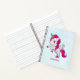 Carnet personnalisé avec une licorne ailée blanche avec crinière rose, queue et sabots. La corne a des anneaux de couleur arc-en-ciel et ressemble à une sucrerie. Cette mignonne licorne s'élève sur ses pattes arrières. Coeur rose doux sur sa joue et de longs cils girly.