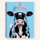 L'illustration présente une vache noire et blanche portant un casquette d'hiver bleu avec des écouteurs et des cordes tressées. L'image combine des éléments de la vie campagnarde avec une touche humoristique, dépeignant la vache dans un style inattendu, ce qui ajoute un charme unique à l'image.