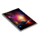 Un OVNI extraordinaire volant à travers un ciel brillant rempli de couleurs vives et d'étoiles.