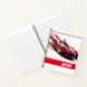 Ce carnet est montré avec une photo d'art de voiture de sport rouge. La couleur classeur est noire. L'exemple de nom personnalisé indiqué Customise cet élément et change le nom en votre nom. Image sous licence