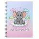 An adorable cartoon baby elephant sitting comfortably on a soft cloud surrounded by pastel colors and stars. This cute and funny design features the text "I'm Ele-Fun-t." Great for kids and animal lovers
