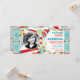 Fun circus clowns in stilts, juggling and holding balloons theme birthday card with photo insert in blues, red, white, and yellow with raffle tickets at side. Just perforate the sides for an easy tear off!