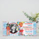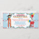 Stilt walker juggling and cotton candy booth with balloons circus or carnival theme birthday invitation card with photo insert and raffle tickets at side. Just perforate the sides for an easy tear off! Colours are blues, yellow, red, and white.