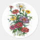 Old-fashioned botanical illustration of zinnia flowers in red, yellow purple and white