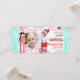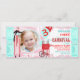 Stilt walkers, cotton candy, and balloons carnival theme birthday card with photo insert in pink, red, white, and aqua with raffle tickets at side. Just perforate the sides for an easy tear off!