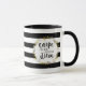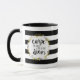 Modern stripes of black and white are the background for this funny mug that reminds us to seize the day. "Carpe the heck out of that diem" quote is framed with a wispy, natural wreath of florals and greenery and makes a great coffee mug to start your day and morning coffee with.
