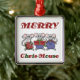 Trois souris de Noël avec des cadeaux de vacances et le texte rouge et vert qui dit "Joyeux Chris-Mouse" sur des ornements de vacances pour décorer votre arbre ou donner comme cadeaux!