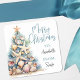 Add a warm and coastal touch to your holiday wrapping with this square Christmas gift tag featuring a watercolor Christmas tree made of beach shells, starfish, and coral. The tree is placed on the left side of the tag, resting in soft sand with teal blue water accents for a laid-back tropical feel. The color palette includes soft greens, tan, and coral-red tones for a relaxed, beachy vibe.