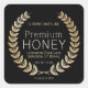 Les mots "HONEY" et "Premium" sont imprimés dans une police de texte en or gaufré. Bordure de feuille de laurier avec gradient doré. Étiquette carré avec arrière - plan noir montre le texte en or. Bonne apiculture !