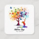 Carte simple d'un arbre coloré, d'oiseaux et de femmes faisant du yoga. Couleurs vives