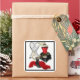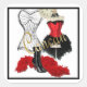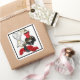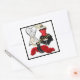 Un autocollant carré qui correspond à notre invitation "Cancan Costume 1" avec l'image d'un corset de fil noir, une robe avec un costume de cancan rouge avec une agitation de plumes noires, un collier de perles noires, une paire de bottes de cancan noir, un boa de plumes rouges, et une partie d'une horloge murale sur blanc. Bordure noire. Voir invitation et enveloppe correspondante. Voir l'ensemble de la collection Cancan Sticker dans les INVITATIONS | Section Stickers & Étiquettes.