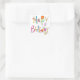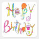 L'autocollant Joyeux Anniversaire présente de l'art éblouissant dessiné à la main à l'aide de ballons, d'un cupcake et d'un gâteau d'anniversaire pour aider à former les lettres. Les couleurs sont rose, bleu turquoise, vert, jaune et orange sur un arrière - plan blanc.