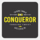 "Plus qu'un conquérant" badge de design de typographie chrétienne. Tapez dans le style emblème avec des lettres jaunes et noires, "Je suis plus qu'un conquérant à travers le Christ qui m'aimait." La référence de l'écriture est de Romains 8:37.