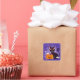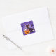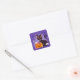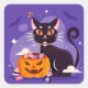 Un chat noir fantaisiste aux yeux brillants est assis à côté d'un citrouille rempli de bonbons colorés. Le chat a une expression ludique contre un arrière - plan violet éffrayant avec des chauves-souris et des nuages.
