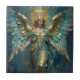 A beautiful angelic tile with a beautiful angel with a turquoise marble background and a gold halo in an impasto style.