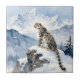 A pretty wildlife ceramic tile with an illustration of a majestic snow leopard perched on a craggy, snow-covered peak, gazing out at a vast, frozen mountain range.