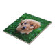 Adorable portrait photograph of a puppy sitting in the grass staring up at the camera.