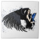 Un ange gothique tout en noir tient un chat noir avec des ailes de fées bleues. les deux sont dans un fond blanc avec de la peinture bleue. Fleurs tribales noires bordant le fond d'elles