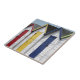 Ce carrelage en céramique est décoré d'une photo de cabanes de plage traditionnelles en bois colorées à l'anglaise. Elles sont peintes en blanc, avec des portes en rouge primaire, jaune, bleu et vert.
