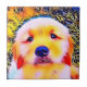 Cette tuile comporte une peinture vibrante d'art d'un chiot mignon de golden retriever, rendue aux nuances du bleu, du jaune et de l'orange.
