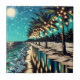 Joli art côtier Ai romantique représentant une rangée de palmiers avec des lumières blanches illuminées. Une jolie réflexion sur la plage de sable et les vagues.
