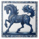 Un étalon azur, pris à mi-chemin, incarne la grâce botanique sur ce carrelage en céramique. Des motifs floraux détaillés, qui rappellent les fleurs délicates, traversent le corps du cheval, la crinière qui coule et la queue, jusqu'à sa selle ou son harnais décoratifs. L'artiste dépeint habilement les puissants muscles et les mouvements fluides de l'animal. Une bordure de motifs floraux complexes dans la même teinte bleue profonde encadre l'image. La composition équilibrée et une perspective légèrement surélevée soulignent la posture dynamique du cheval. Couleurs feutrées et lumière tamisée créent une atmosphère sereine et vintage, évocatrice de l'artisanat classique du carrelage. Ce design méticuleusement rendu rayonne de la beauté classique et de l'art.
