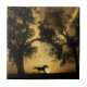 Il s'agit d'une belle tuile d'art équestre avec un cheval galopant au lever du soleil, planté de chênes et d'oiseaux.