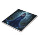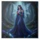 Une belle fée portant une robe bleu foncé coulante et un collier de saphirs avec des saphirs dans ses longs cheveux bleu foncé et des ailes translucides comme des libellules tenant un aster se dresse dans un étang peu profond dans une forêt magique entourée de maîtres, de champignons oranges et d'arbres couverts de vignes, de fleurs et de champignons.