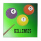 Un design cool pour la salle de piscine. Trois boules de billard en violet, orange et jaune avec un repère de billard dans le coin. Un arrière - plan vert ombragé...
