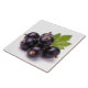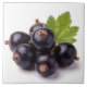 Close-up, photorealistic studio shot of ripe, glistening black currants with water drops and single vibrant green leaf.