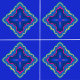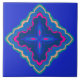 bleu azur, liseré, vert géométrique, jaune moutarde, bleu, rose. Carré.