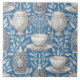 Vintage tea cups, tea pots and vases on a blue background and white ornate leaf design ceramic tile.