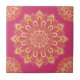 Ce carrelage en céramique mandala rose framboise et jaune aux couleurs vives et audacieuses présente une élégante dentelle style lotus motif de médaillon de fleur de lotus avec le coeur dans les pétales.