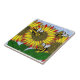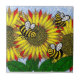 Une tuile avec trois bourdons drôles bourdonnant autour de grands tournesols jaunes et oranges lumineux.
